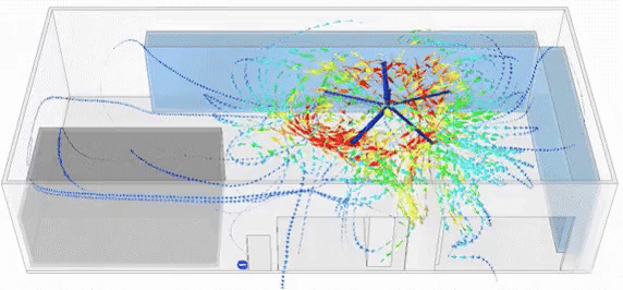 Nuestros ingenieros utilizan simulaciones de Dinámica de Fluidos Computacional (CFD) para garantizar que cada instalación sea perfecta. Este diagrama muestra el perfil de velocidad del aire y cómo nuestros ventiladores rompen la estratificación térmica, eliminando bolsas de calor estancado. Gracias a este rigor científico, podemos predecir con exactitud el rendimiento térmico de su nave antes de instalar el primer equipo, asegurando una cobertura total y un flujo de aire constante a nivel de operario.
